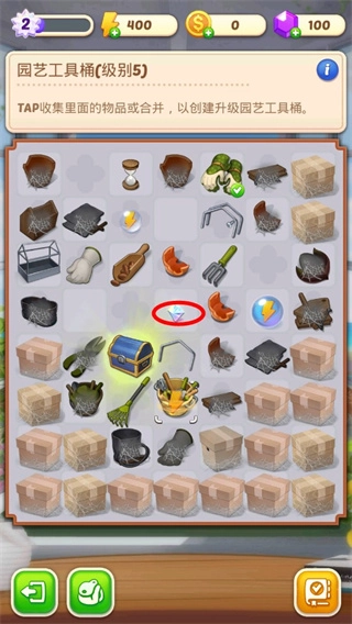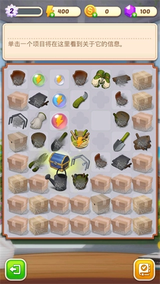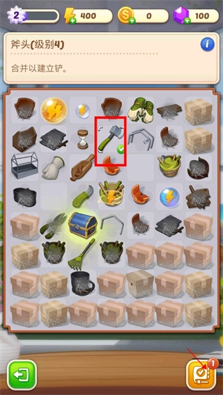 1、首先大家打开游戏后会看到庄园比较杂乱,所以我们要着手进行整理,点击中间那个带对钩的按钮。