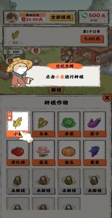 4、完成首个订单后解锁新订单需求,当前任务需同时交付小麦、玉米、白菜三种作物