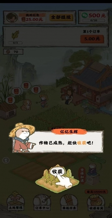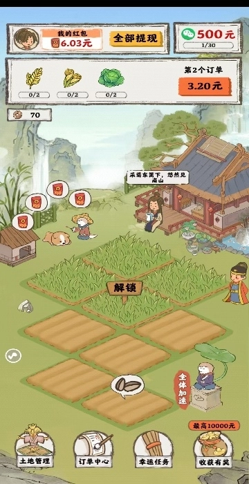 3、特色订单系统需要玩家依据居民的需求来精准搭配农作物,完成订单后能够得到金币和红包的双重奖励,随着订单量的累积还能提高提现收益的比例。