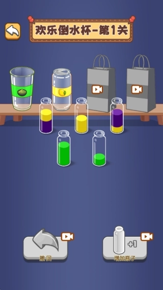 3.如下图所示,在欢乐倒水杯这一关卡里,玩家要把玻璃瓶中的不同颜色水分门别类地倒好。