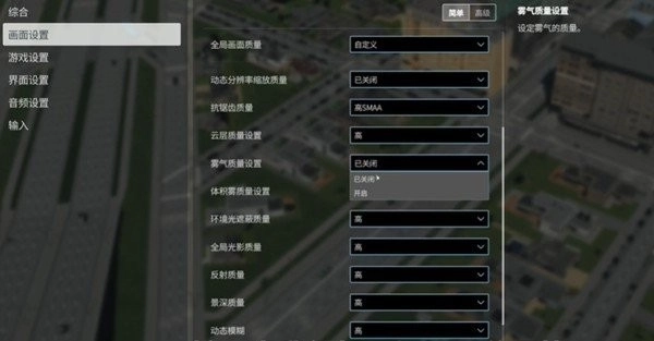2、先在综合页面将性能优先调整为帧率优先,与此同时,在画面设置中把雾气质量这一项关闭。