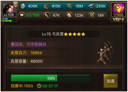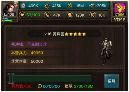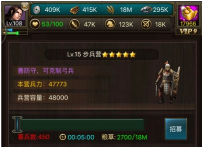 兵营能提升士兵容量上限,这样作战时就不会因兵力不足且招募需时而错过战机。右下角的募兵加时功能十分关键,若你并非能开启多队列的土豪玩家,建议至少买到50分钟;另外队列也推荐多开1 - 2行(分别花费200元宝、400元宝),这能节省不少时间。