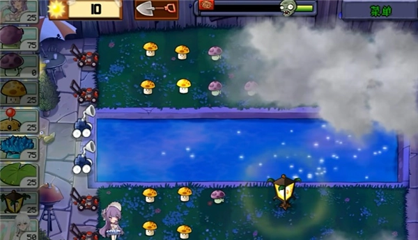 4、接着种植蘑菇持续收集阳光,安排植物娘的摆放位置,消灭来袭的僵尸。