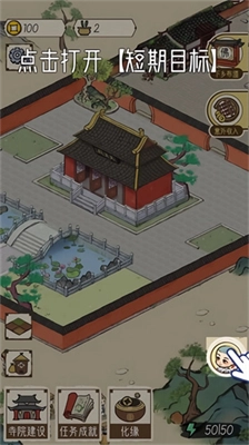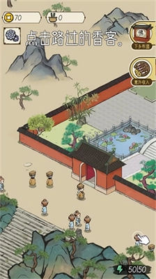 1、在一段漫画风格的剧情介绍后,你就会正式开启游戏之旅。在游戏里,你将化身主持,得依靠自身能力重新修缮寺庙。点击路过的行人,就能引导他们进入寺庙。