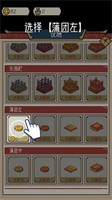 3、在这里可以挑选蒲团、围栏、佛像之类的各类道具,只是前期钱币不足,暂时只能购买蒲团。