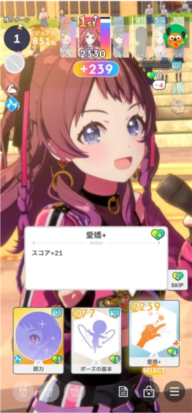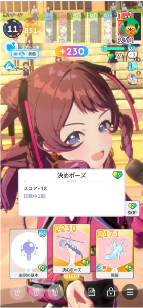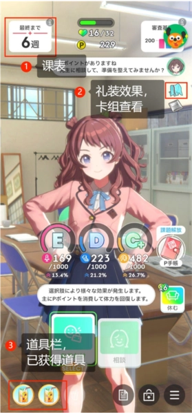 ③是道具栏。由于我没怎么打开过商店,所以对道具没有详细了解。常见的道具类型有:能让当前卡牌升一阶的道具、使用后可恢复3点体力的道具(这类道具通常用于配合高打点打出高爆发,恢复体力的效果几乎用不上)、能增加3点集中值的道具(比如高跟鞋跳板),还有能让技能再触发一次的道具(手牌好的时候一定要先使用这个道具,否则可能无法生效!!)