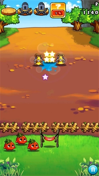 第2关:和上一关比起来,怪物战队的实力提升了不少——不仅数量变多了,攻击范围还缩小了很多。它们的布局依旧是分散列队,另外还新增了不少贪吃熊,这让过关难度明显上升。不过要是能把蔬菜们的技能都好好利用起来,用大蒜配土豆的组合去挑战,拿到3星评价还是挺顺利的。