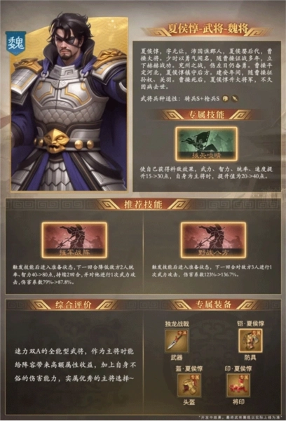 夏侯惇是兼具速度与武力双A评级的全能型武将,担任主将时可为整个阵容提供高额的属性加成,再加上他自身出色的伤害输出能力,无疑是非常优秀的主将人选。