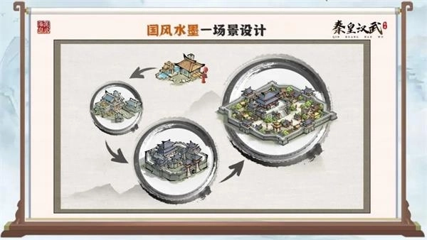 这段文本可以修改为: 游戏的美术设定深入考究历史底蕴,采用国风水墨风格来塑造秦皇汉武时代的整体风貌。通过这样的场景与地图设计,旨在呈现出更具韵味、更有意境的游戏画面。