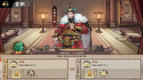 游戏里融入了轻松的模拟经营元素。各位主公完成主线任务就能拿到一些“名声”奖励。再配合支线任务和奇遇玩法,能更快地积攒“名声”来提升官职。官职的高低会影响主公们的每日俸禄、领地范围以及建筑规格等。总不能都把天下收入囊中了,还只是个小小的县令吧?