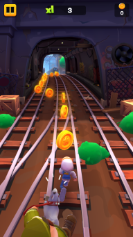 4、除了避开障碍物,我们还要尽量多拾取铁轨上出现的金币。金币不仅能让我们在游戏中获得更高得分,还可用来购买其他角色。