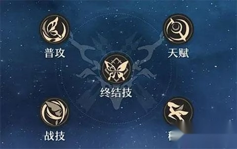 角色行迹共有五个,分别是普攻、战技、终极技(大招)、天赋和秘技。其中前四个都比较容易理解,而秘技主要用于跑图场景,比如在战斗开始前为角色施加增益效果等。