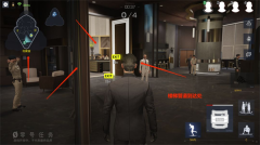 1从1楼A点望向二楼E点窗户走廊,能清楚看到有2个下落点,它们分别与E点1号下落点的楼梯管理处以及E点2号下落点的厨房管理处相对应。另外,务必留意左侧小地图的划线位置(此处常常是潜入方和追击方产生纠缠的地方),要是队友倒地,可借助这些落地点展开救援。