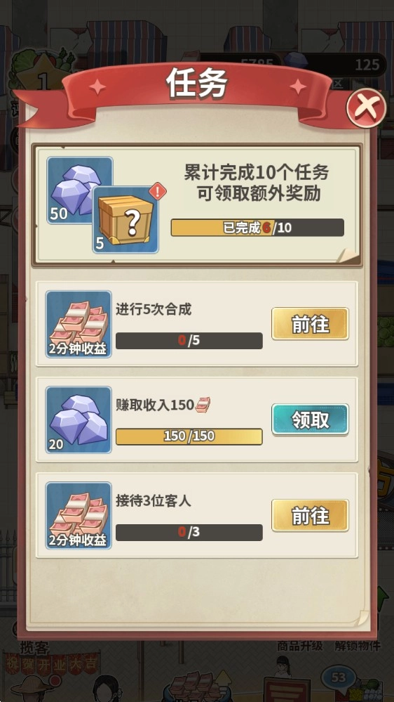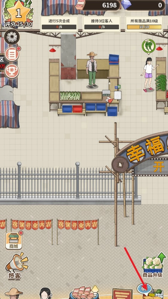 2、通过合成的玩法,解锁更多的物品,提升菜市场的环境。