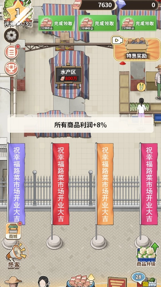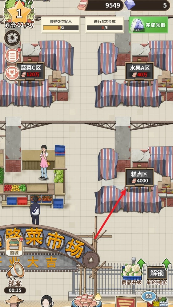 1、不断地扩大菜市场,获得更多的摊位,售卖更多的物品。