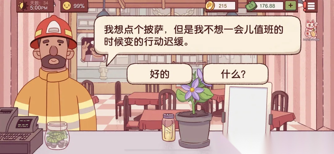十一、消防员不想行动迟缓:纯素食披萨=白面饼+蘑菇、橄榄、洋葱、青椒、凤梨、罗勒叶、玉米(没解锁的食材不用管)