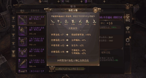 装备的强化呢是要用到三种不同的宝石的哦,最初的零转装备强化是要用到祝福宝石的,当你强化装备到+6以后就要更换成灵魂宝石了,再继续强化到+11以上需要用月华宝石哦,这些宝石是可以用积分购买的。上面说的装备分为零,一,二,三,四转装备,那么满强化的程度也是不一样的哦,零转的装备最多强化成为+11的,一转的是+13,二转的是+15三转的是+16,四转的也是+16。并且当全身装备强化到一定的程度的时候是会出现一些附加的属性哦,也是非常的强力。