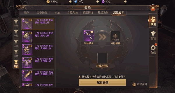 一个装备的属性的强化,幸运,追加,卓越转移到另一个装备上,当你有更强力的装备需要更换的时候就可以使用这个功能哦,可以减少你的材料呀,财力呀什么的消耗,可以说是非常良心的一项玩法啦,可以省下很多东西呢,不过要求也多,第一必须是同职业的同转数的同部位的装备,第二必须是原始装备是双卓越及以上的装备,第三要求目标装备不带卓越属性的套装装备。