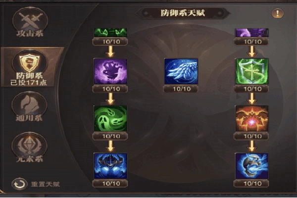 敏法天赋综合思路加点顺序:防御系左路(兼顾中路)→防御系右路→攻击系右路→攻击系左路(兼顾中路)→通用系右路(兼顾中路)→元素系右路→元素系中路→元素系左路→通用左路,图中中路加点的最高点为兼顾必点点数,温馨提示“敏法需要防御和攻击系天赋成型才能能抗又能打,7转以前敏法PK是不强势的
