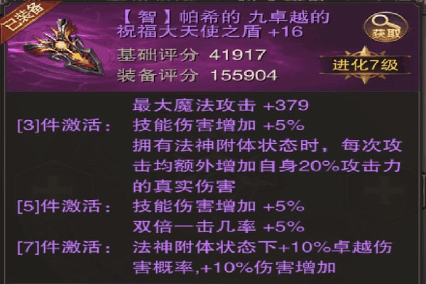 1、装备:二转穿智力法师装备,拥有法神状态下的每次攻击额外20%攻击力的真实伤害