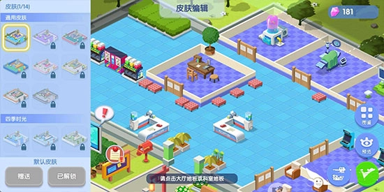 当你点击“皮肤”按钮,左侧就会弹出皮肤选择栏。在选择心仪的皮肤后,点击大厅以及科室的地板,就能完成皮肤更改。大厅与科室能够分别选用不同的皮肤,从而打造出个性化的装饰效果。
