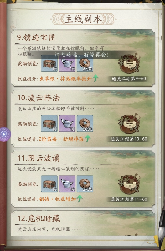 2. 挑战主线副本,若能成功通关,便可获取额外收益,像江湖阅历、铜钱之类。
