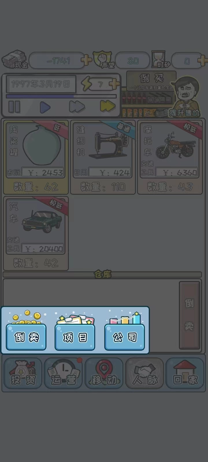 2、然后跟着教程走,教程结束以后,玩家可以点击【投资】,选择赚钱的方式,一共有三种倒卖、项目以及公司;