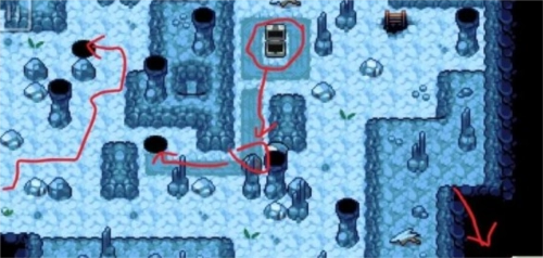 依旧是第三层,最下方的那个冰场起初无法通行。要走右边的梯子,上去之后能看到一个箱子。把技能切换为“推”,按照图示将石头推下去,这样才能通过第三层的那个冰场。