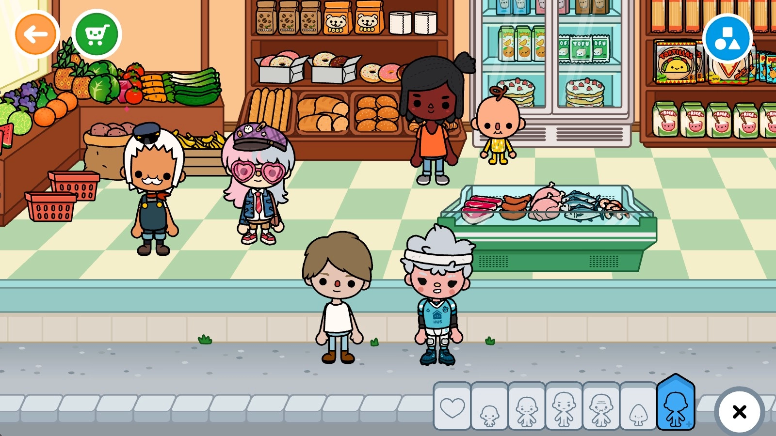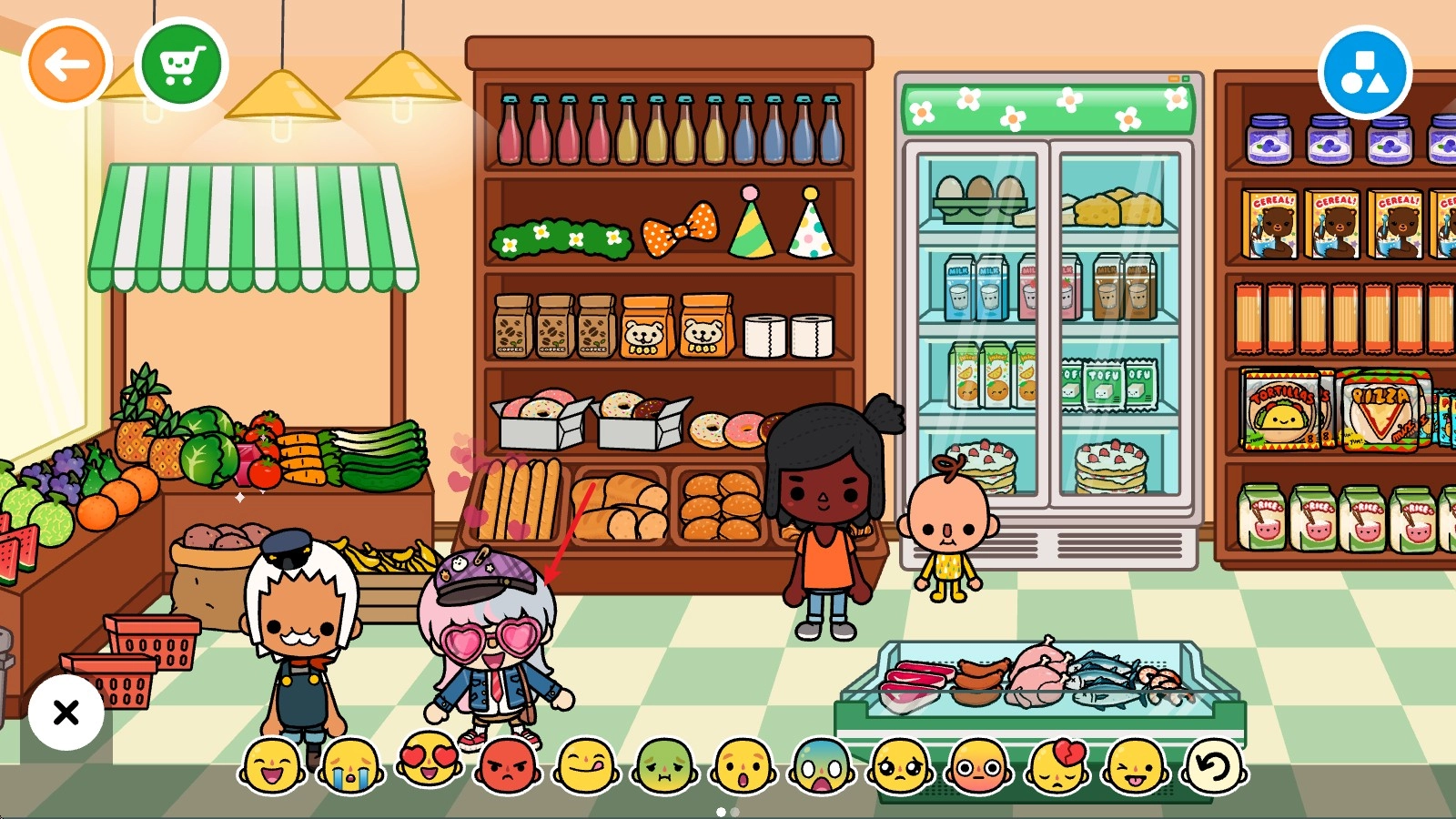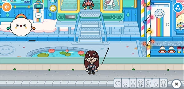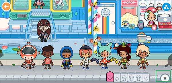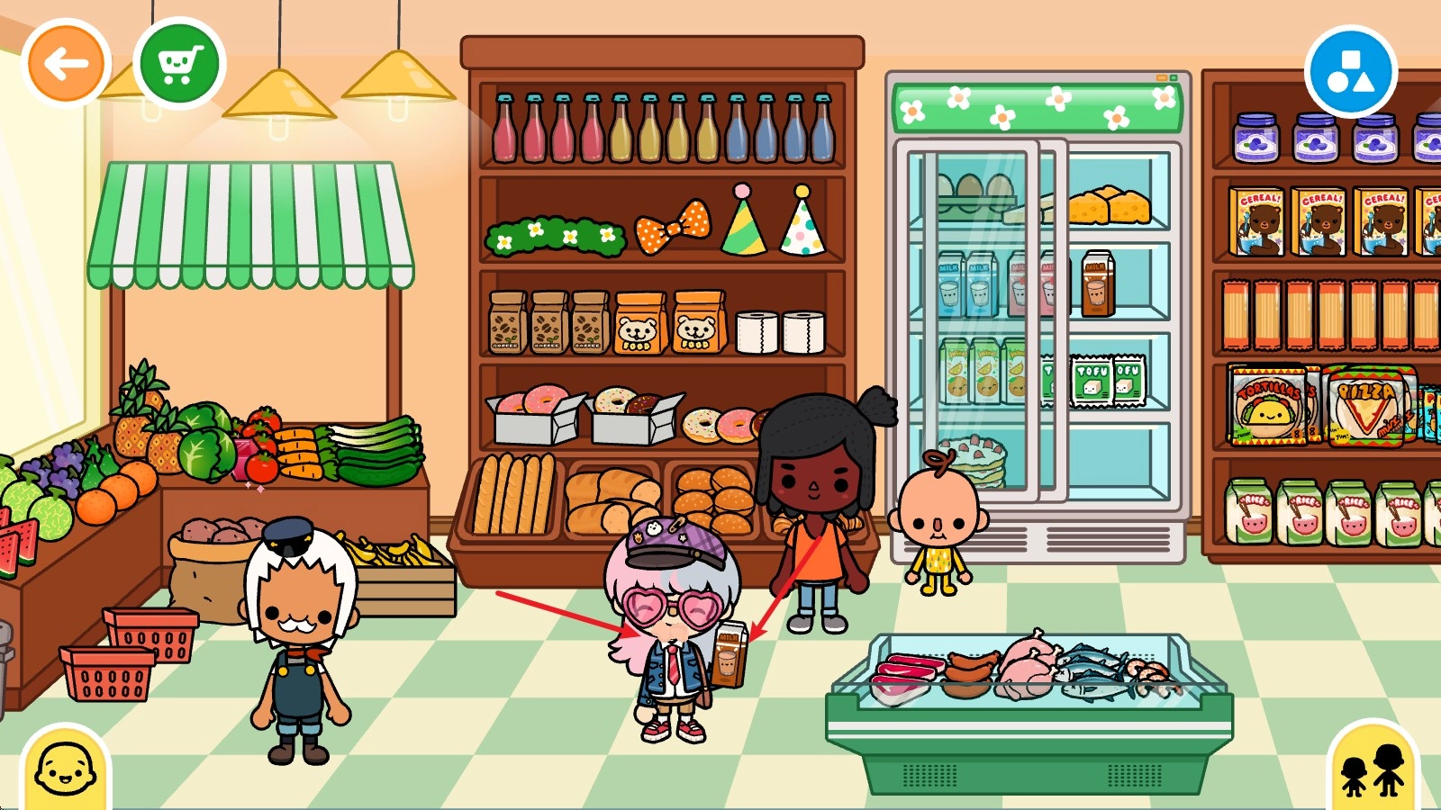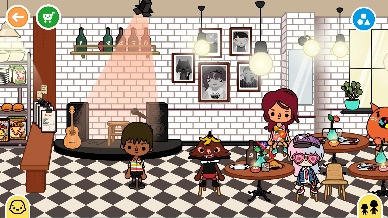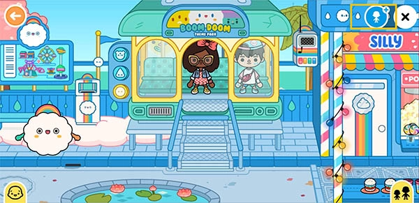比如此刻,我们已经走进了一家商店里面。点击右下角那个黄色的小人图标,就能把自己之前创建好的角色添加到当前场景里了。