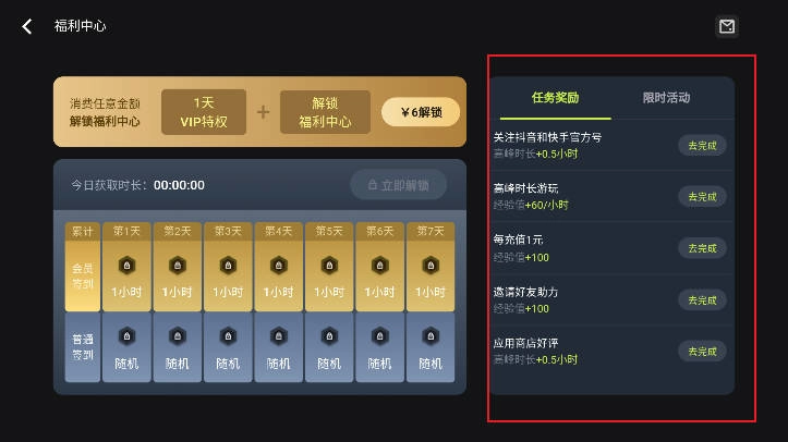 通过完成右侧的任务或者签到可以免费获得时长。