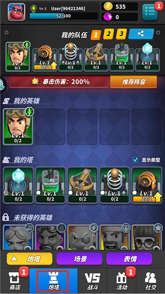 3、进入【炮塔界面】后,玩家能够在此处搭配专属阵容、查看英雄信息、升级塔楼设施,还可以管理场景与表情。