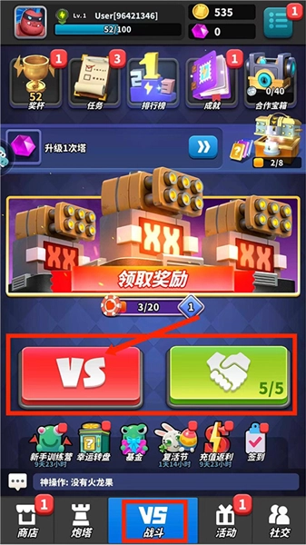 4、进入【战斗界面】后,能看到玩家当前的奖杯数量、任务、排行榜与成就,还可在此领取奖励。其中【VS】是单人匹配模式,【5/5】为好友组队模式,选择对应的模式即可开启游戏对战,接下来以【VS】模式为例进行说明。