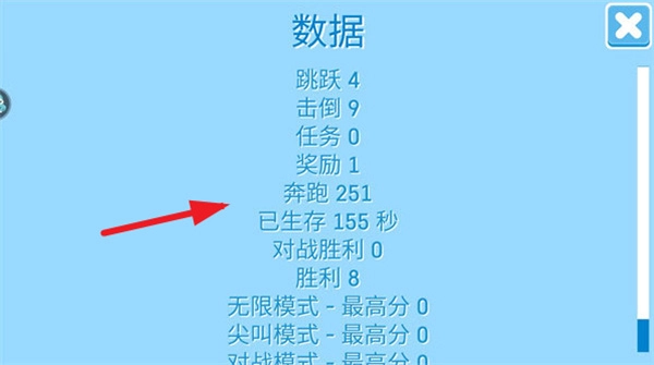 6、要是完成比赛,还会出现一个统计数据,会显示角色的跳跃次数、生存时间等信息。
