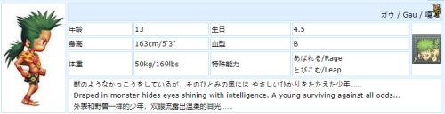 8.嘎(Gau):在兽原长大,拥有复制怪物技能的能力,形态和能力都变化多端。