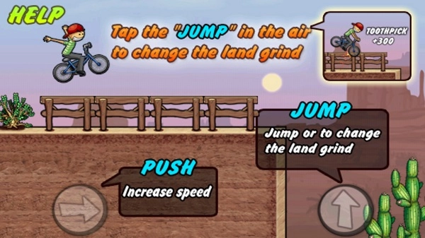 在道路上加速或避开障碍物,尽可能获取分数。点击屏幕底部的两个按钮(右侧一个用于加速,另一个用于跳跃),在空中完成各种高难度动作来提升积分。