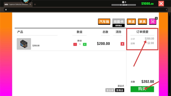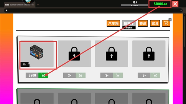 3、在商品界面选择【20x-汽车箱】,花费【$200】完成购买,这是推进订单流程的基础环节。