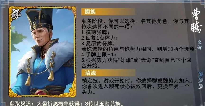 曹腾仅能通过玉玺这一个稳定途径获取,其获取成本实在有些鸡肋。而且曹腾的实用场景相当有限,只有在排位模式里才算得上有用,在军争模式中的出场机会都寥寥无几。可以说,真正需要用到曹腾的玩家往往买不起或舍不得买,而有能力购买的玩家又未必看得上他。所以综合来看,并不推荐大家入手曹腾。当然,如果真的实力雄厚,玉玺储备量远超常人,那自然可以根据喜好随意购买。