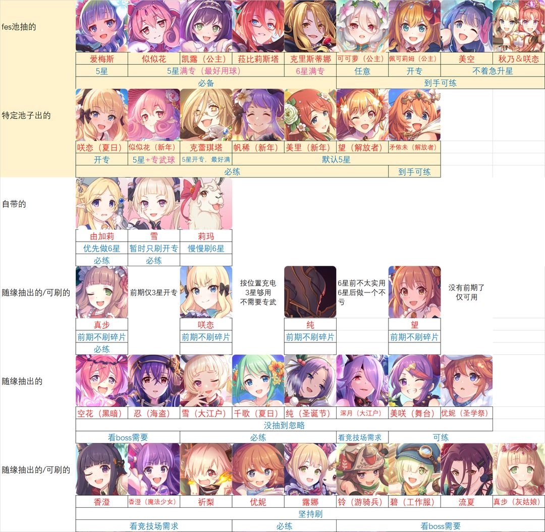 这里只明确了“该练哪些角色”,但没说明“具体该如何培养”。先说明一下:前两行列出的角色属于限定类,他们的碎片只能用“女神的秘石”(也就是大家常说的母猪石)来兑换;后面的角色则是常驻角色,他们的大部分碎片都有常规的获取途径,具体怎么刷取会在下面介绍,建议耐心看完。另外要强调的是,所有能通过常规途径刷到碎片的角色,都不建议大家用母猪石去兑换。
