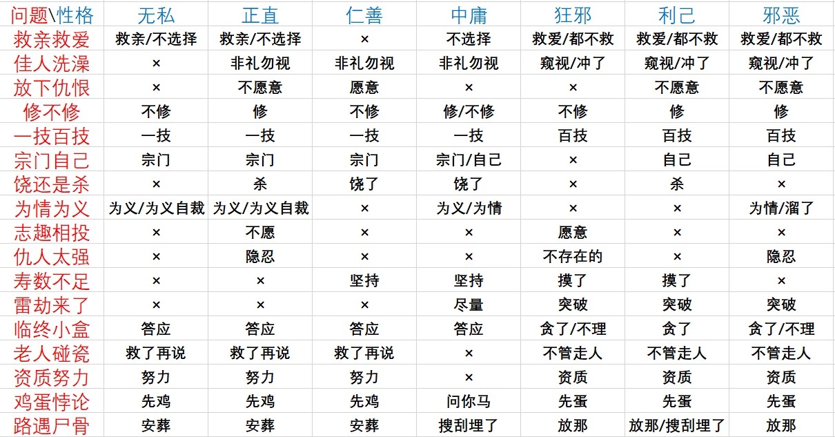 只要好感度足够,基本上就不会失败。论道时选择的选项要契合对方的内在性格。答对的题目越多,获得的心得就越多。和境界比自己高出一级以上的对象论道,能得到最多的心得。下面是简易的论道答案表。