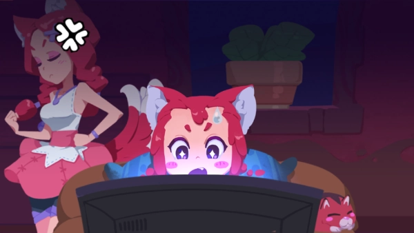 2、进入短暂有趣的剧情翻,阿哩很晚了还在玩电脑被妈妈发现了赶去睡觉了。