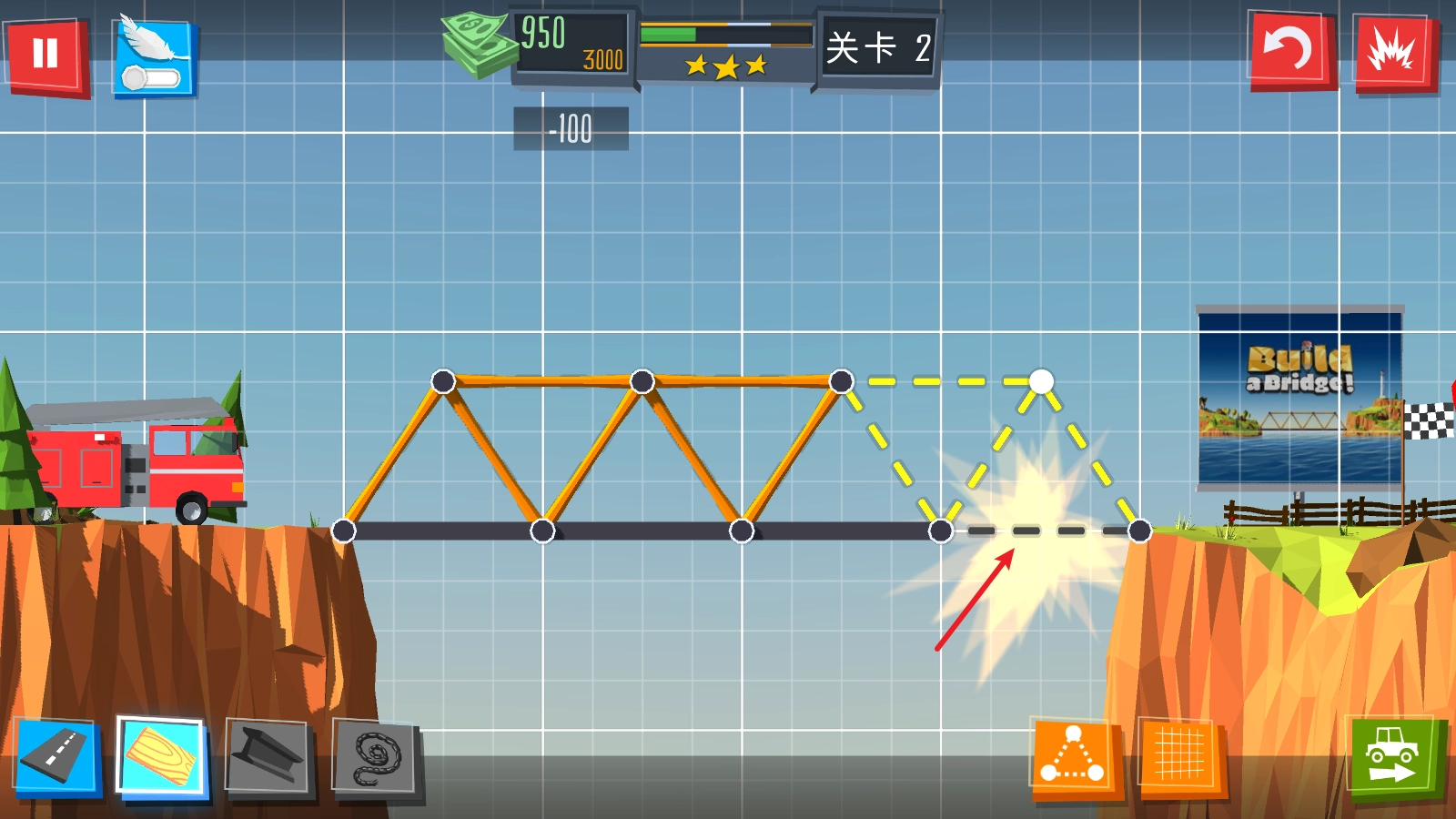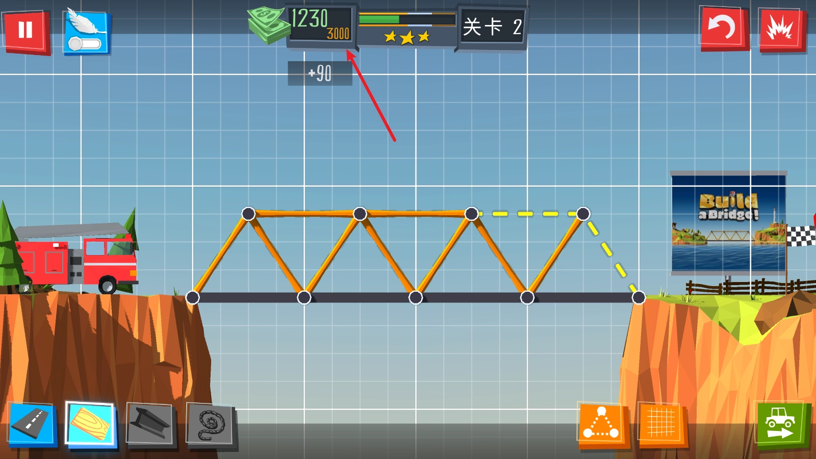 3、每次放置材料都会消耗对应的预算,我们得在预算范围内完成桥梁的搭建。