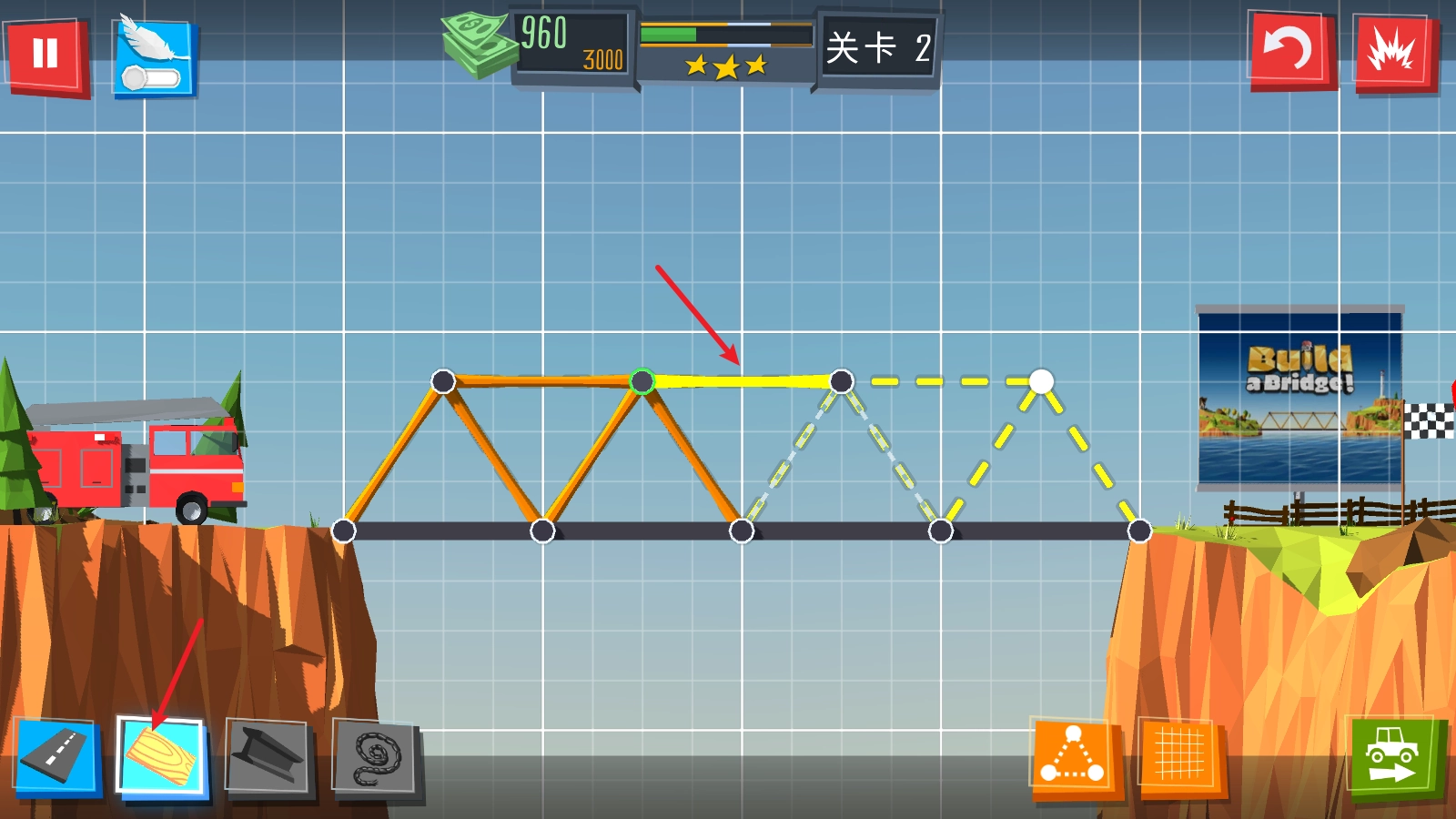 2、进入规划阶段时,游戏会展示简洁的2D界面。你需要在此挑选最合适的建桥材料,搭建出韧性最强的结构。每一个关卡都是一道复杂的谜题,得用最高效、最出色的方式来。也别害怕尝试新想法——你尽可以放开思路,设计出看似离奇却能成功承重的桥梁。无论采用哪种方案,过程都会充满乐趣。