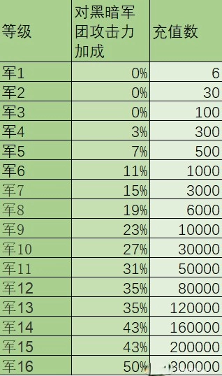 从3级军阶起,每提高1级,针对黑暗军团的攻击力加成便会增加3%(此信息仅在部分来源中有提及)。