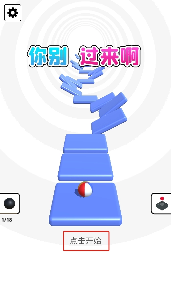 1、进入作品后,点击下方按钮,让彩球顺着蓝色路径滚动,注意前方曲折的平台,控制好滚动方向,避免彩球掉落。