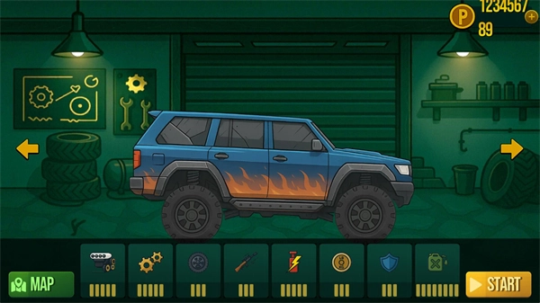 3、在正式进入游戏前,玩家能够对自己的车辆进行升级操作,你可以挑选不同的设施来提高车辆等级,升级完成后点击“start”按钮即可开启游戏。
