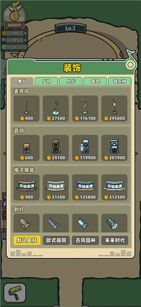 5、消耗金币能够为广场、舞台、外街、餐吧、音乐树购置各类装饰品,让这些场所变得更加绚丽多彩。
