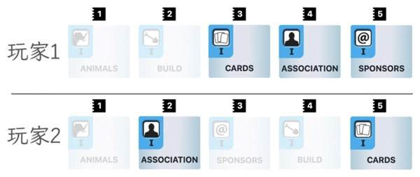 每位玩家均通过一套五张行动卡开展游戏,行动的强度取决于卡牌当前所处的槽位。