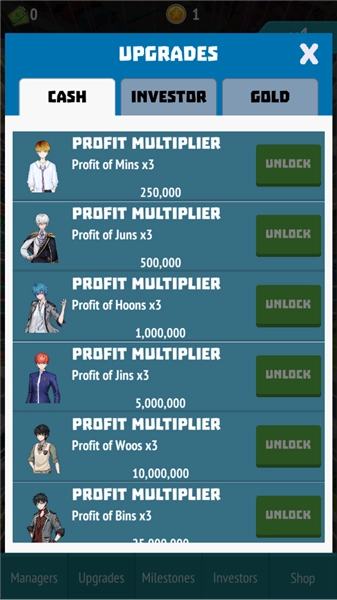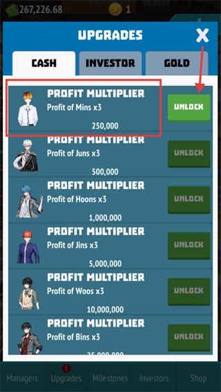 4、进入【UPGRADES】板块的【CASH】页面后,建议优先解锁那些成本低但收益高的升级项,比如【MIN】对应的“利润×3”升级——花费25万解锁该功能后,能显著提高对应偶像的收益,从而加快资金积累的速度。