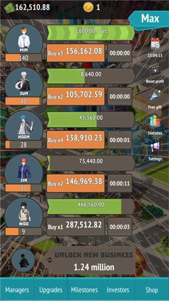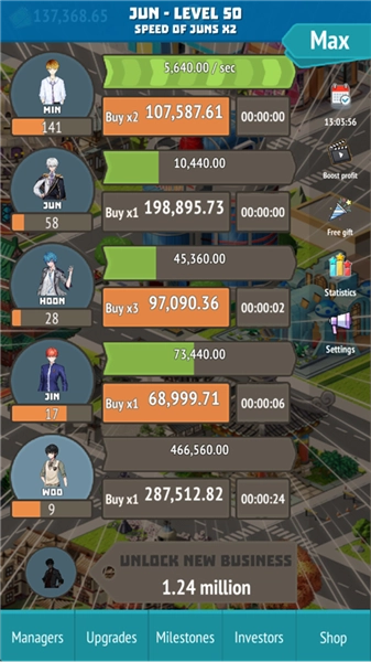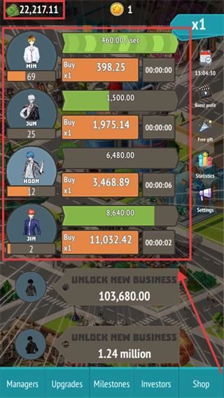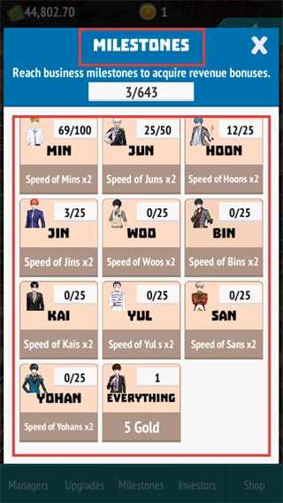 1、点击偶像对应的【Buy】按钮,可对【MIN】【JUN】【HOON】【JIN】等偶像进行升级,以此提高每秒收益;积累足够资金后解锁新业务,并进一步扩大偶像团队规模,从而增加整体总收益。