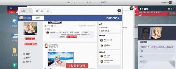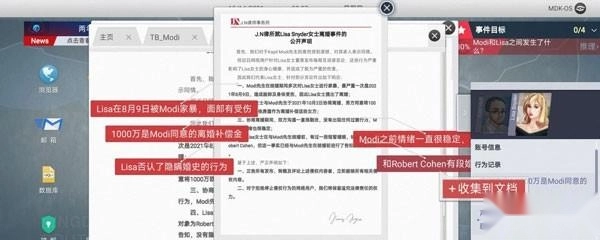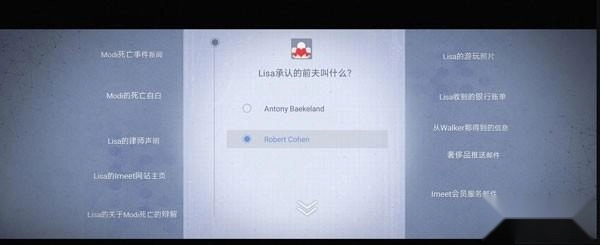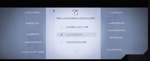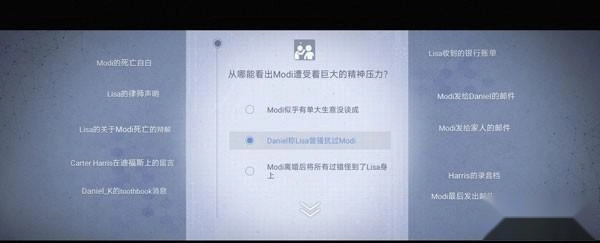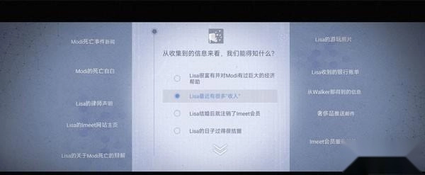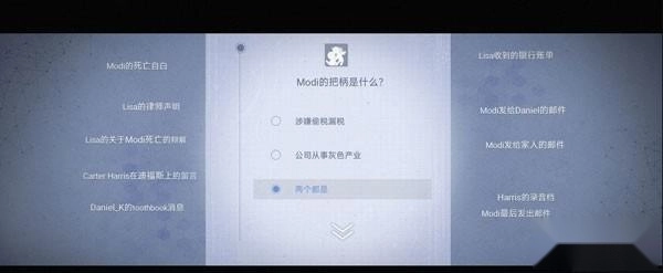 18. 收集完之后点右上角推理,第二个推理【Lisa骚扰Modi】—【两个都是】—【面临破产】。
